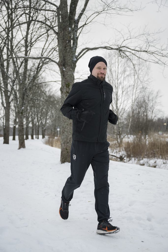 Juoksuharrastus on ympärivuotista. Talvella hän lenkkeilee nastalenkkareissa.