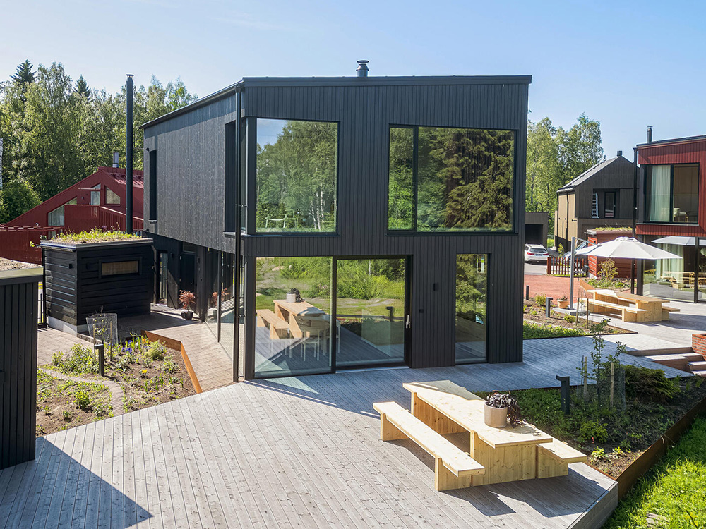 Palkitut kohteet ovat kahden oululaisperheen yhdessä toteuttama CLT-rakenteinen pientalokokonaisuus. Erillistaloja yhdistää yhteinen piha, terassi ja kesä­keittiö.